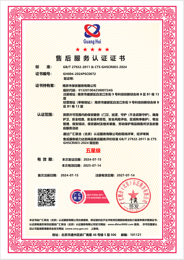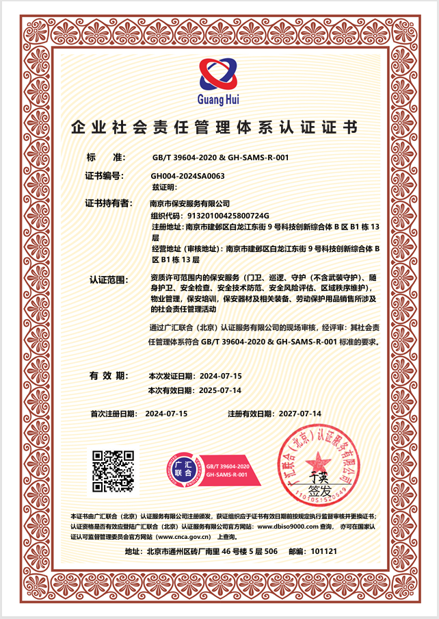 Established in April 1987, Nanjing Security Service Co., Ltd. is a large state-owned security enterprise with a long history of security operation and rich security experience. Now it is a managing director of both? China Security Association and Jiangsu?Security Association, vice president of? Nanjing Security Association, one of the top class security service companies in Jiangsu Province.